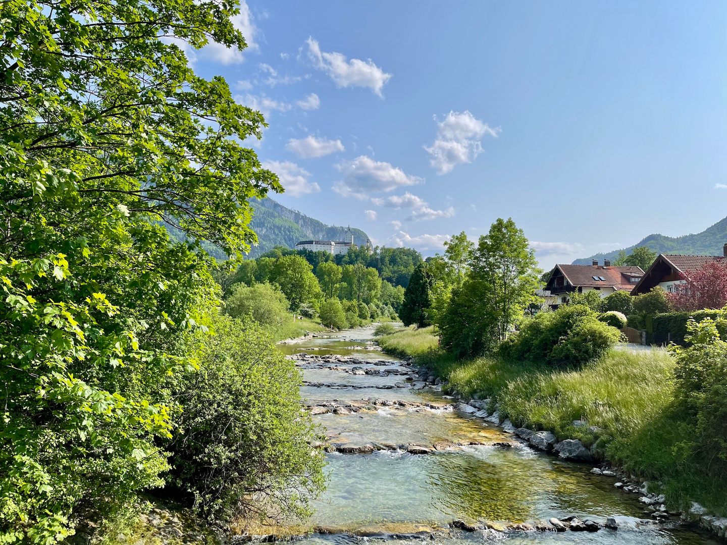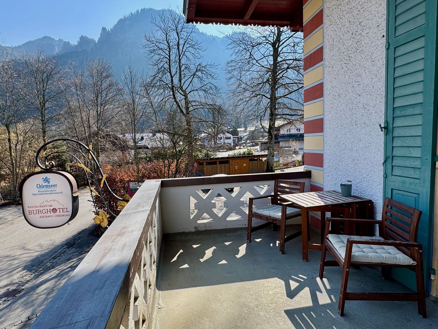 Unser Studio-Apartment mit traumhaften Ausblicken liegt im ersten Stock von "Haus Burg", dem denkmalgeschützten, ehemaligen Gästehaus vom Schloss Hohenaschau. Es ist gemütlich eingerichtet mit royalem Charme und Shabby-Chic-Details. Die Ferienwohnung ist mit Eichenparkett ausgelegt und hat ein 160 cm breites Bett - das schön bemalte Kopfende ist aus Mangoholz -, einer Sitzgruppe mit zwei Polsterstühlen, kostenloses WLAN, einer Küchenzeile mit einer Nespresso Kaffeemaschine, einem mobilen Cerankochfeld und Spülmaschine sowie einem kleinen, aber feinen Bad mit Regenwasserdusche. Die Diele dient zugleich als begehbarer Schrank. Der große Terrassen/Balkon ist mit 2 bequemen Holzsesseln, sowie einem klappbaren Esstisch und Stühlen möbliert. Von hier schweift der Blick sowohl auf Schloss Hohenaschau als auch die Kampenwand und die Gondeln auf ihrer Fahrt zum Gipfelplateau der 1669 m hohen Kampenwand, die mit ihren markanten Zacken das Wahrzeichen der Chiemgauer Region ist. Bedingt Barrierefrei, für Rollstuhlfahrer leider nicht möglich, mit Gehbehinderung durch Lift im Haus möglich.
